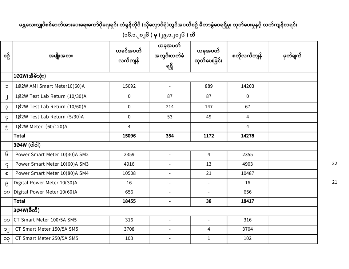 မန္တလေးလျှပ်စစ်ဓာတ်အားပေးရေးကော်ပိုရေးရှင်းတွင် ခရိုင်/မြို့နယ်အလိုက် အပါတ်စဉ် မီတာခွဲဝေရရှိမှု၊ ထုတ်ပေးမှု၊ လက်ကျန်စာရင်းများကိုဖော်ပြခြင်း။