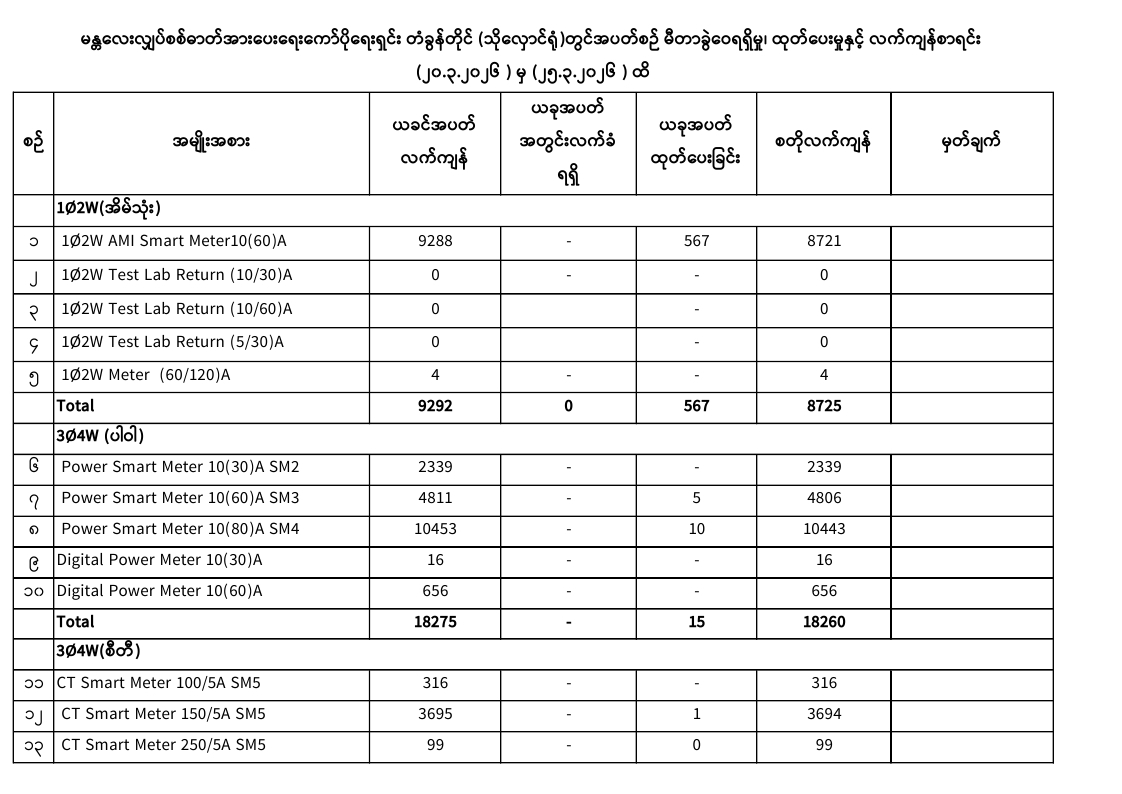 မန္တလေးလျှပ်စစ်ဓာတ်အားပေးရေးကော်ပိုရေးရှင်းတွင် ခရိုင်/မြို့နယ်အလိုက် အပါတ်စဉ် မီတာခွဲဝေရရှိမှု၊ ထုတ်ပေးမှု၊ လက်ကျန်စာရင်းများကိုဖော်ပြခြင်း။