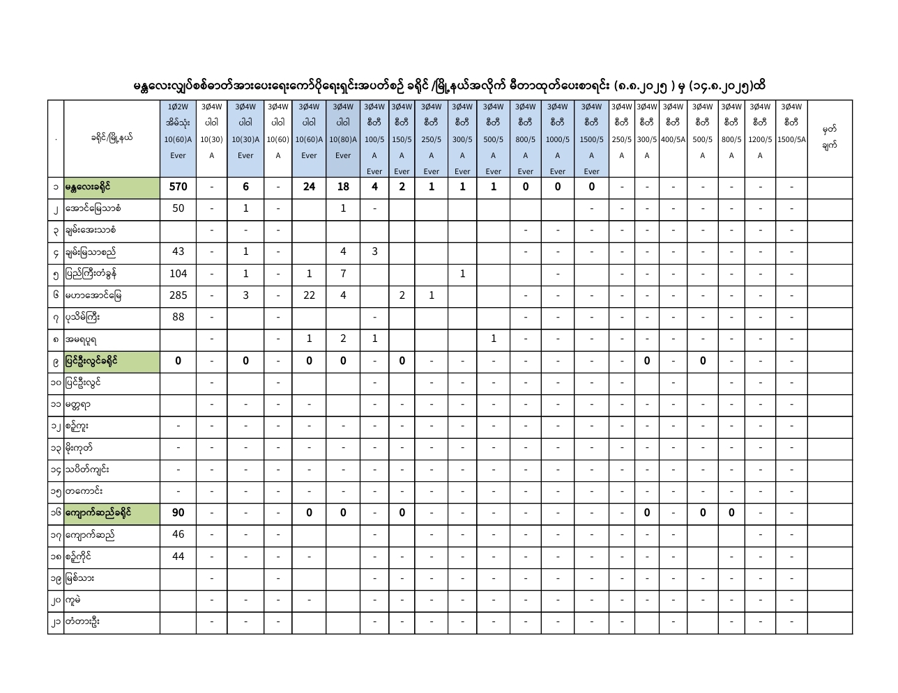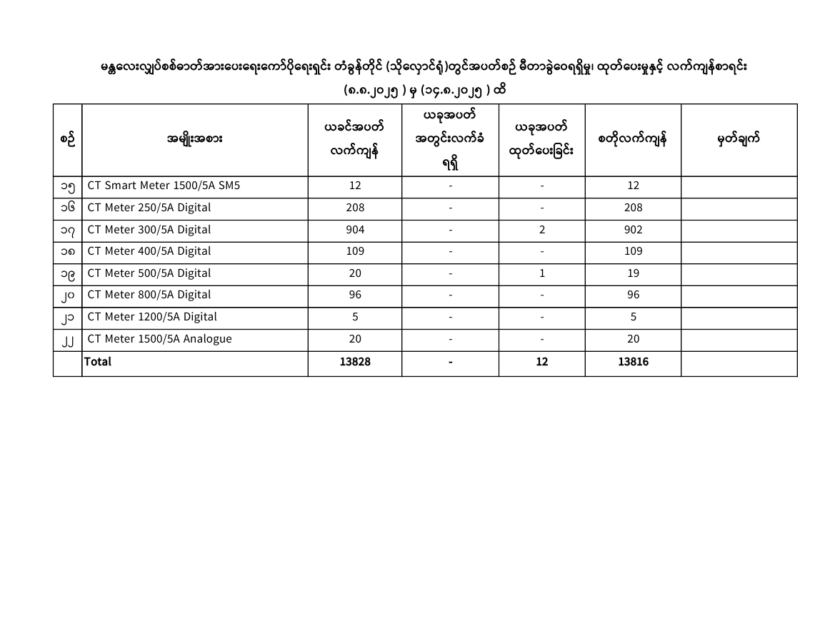 မန္တလေးလျှပ်စစ်ဓာတ်အားပေးရေးကော်ပိုရေးရှင်းတွင် (8.8.2025) ရက်နေ့မှ (14.8.2025) ရက်နေ့အထိ ခရိုင်/မြို့နယ်အလိုက် မီတာခွဲဝေရရှိမှု၊ ထုတ်ပေးမှု၊ လက်ကျန်စာရင်းများကို အောက်ပါအတိုင်းဖော်ပြအပ်ပါသည်-