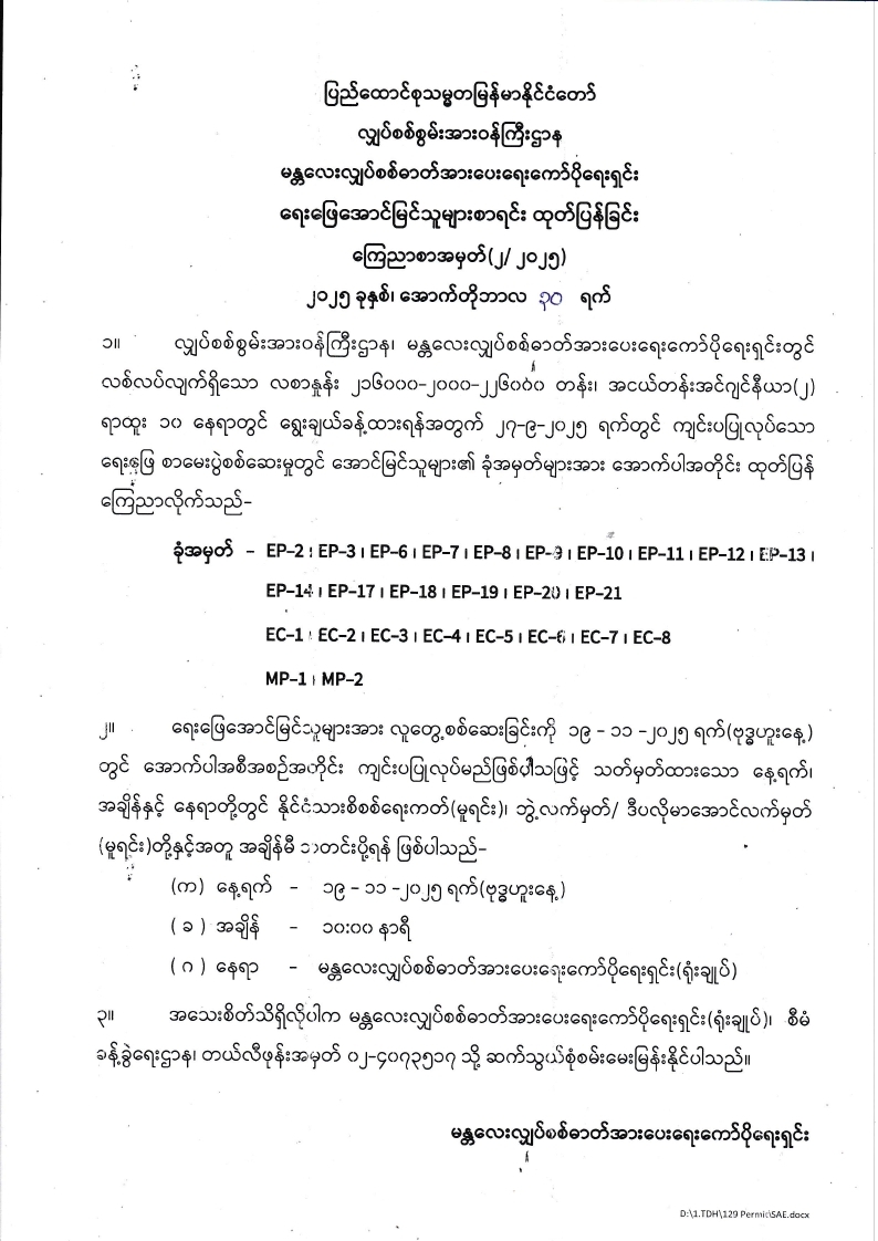မန္တလေးလျှပ်စစ်ဓာတ်အားပေးရေးကော်ပိုရေးရှင်းတွင် လစ်လပ်လျက်ရှိသော လစာနှုန်း ၂၁၆၀၀၀-၂၀၀၀-၂၂၆၀၀၀ တန်း၊ အငယ်တန်းအင်ဂျင်နီယာ(၂) ရာထူး ရေးဖြေအောင်မြင်သူများစာရင်း ထုတ်ပြန်ခြင်း