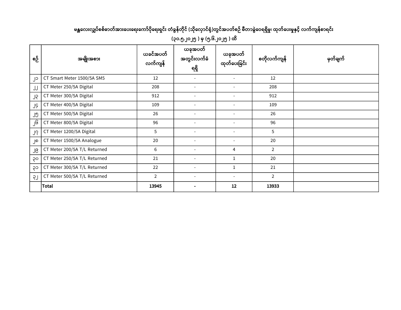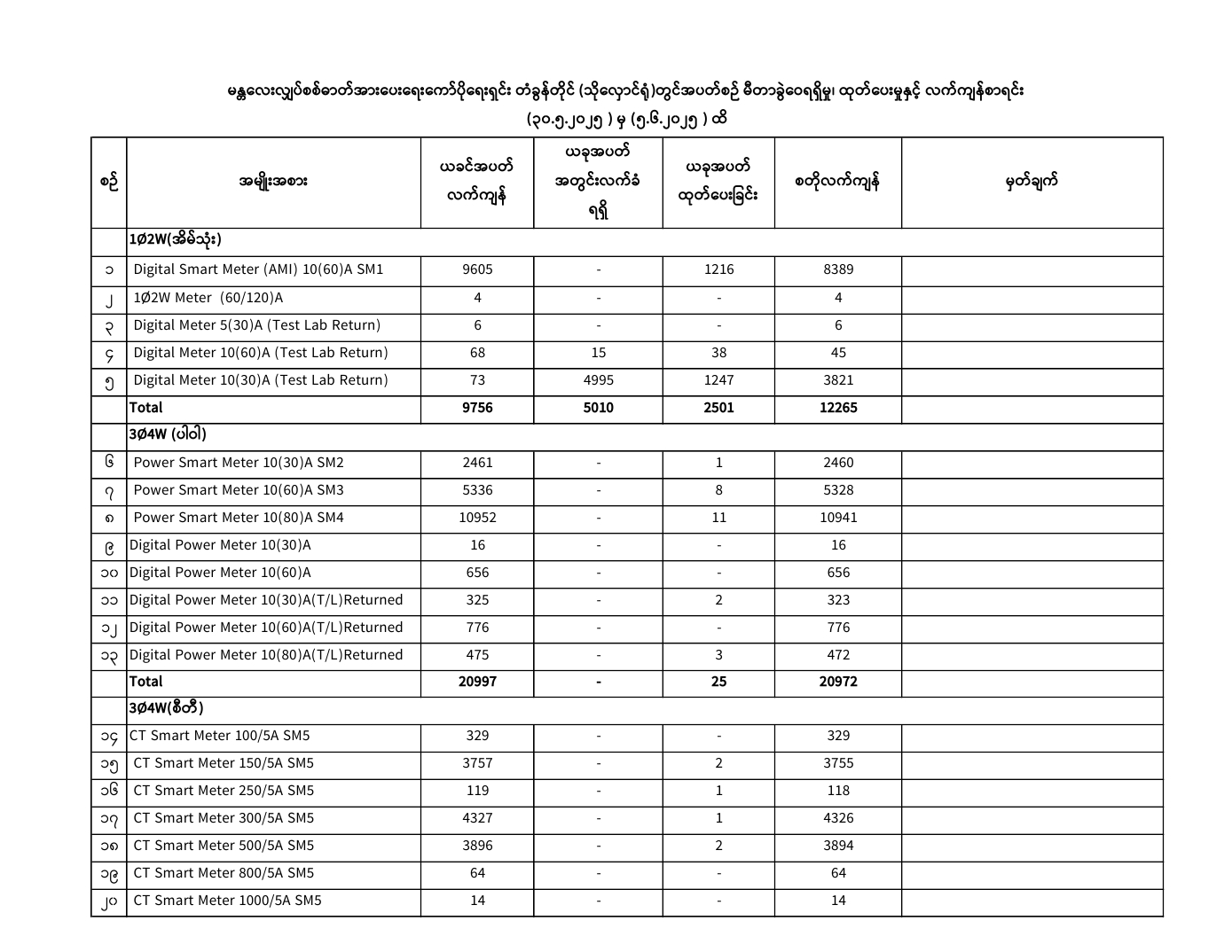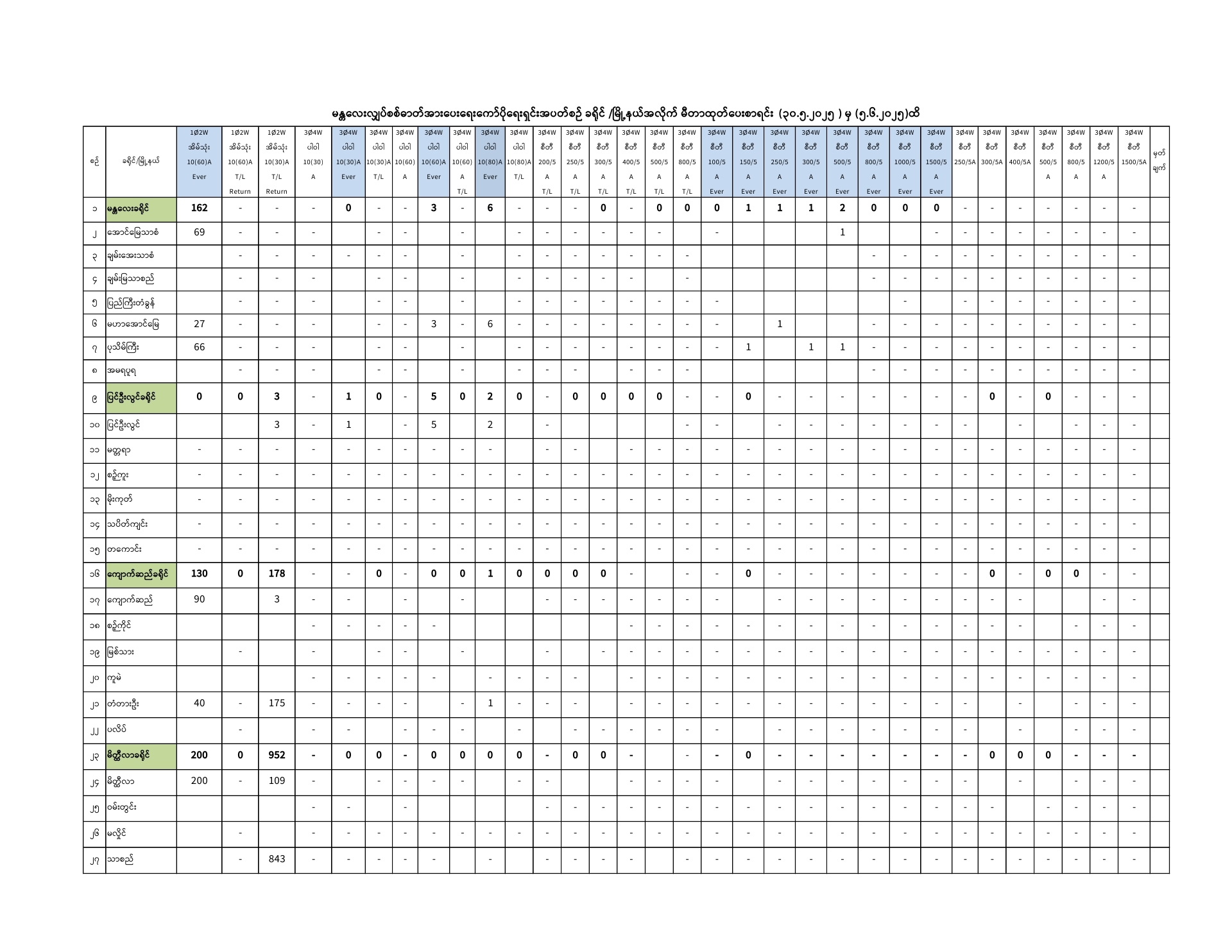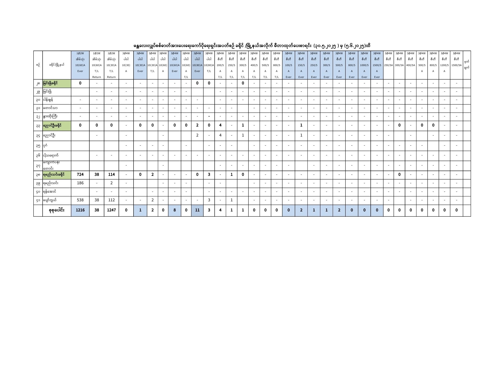 မန္တလေးလျှပ်စစ်ဓာတ်အားပေးရေးကော်ပိုရေးရှင်းတွင် ( 30.5.2025) ရက်နေ့မှ (5.6.2025) ရက်နေ့အထိ ခရိုင်/မြို့နယ်အလိုက် မီတာခွဲဝေရရှိမှု၊ ထုတ်ပေးမှု၊ လက်ကျန်စာရင်းများကို အောက်ပါအတိုင်းဖော်ပြအပ်ပါသည်-