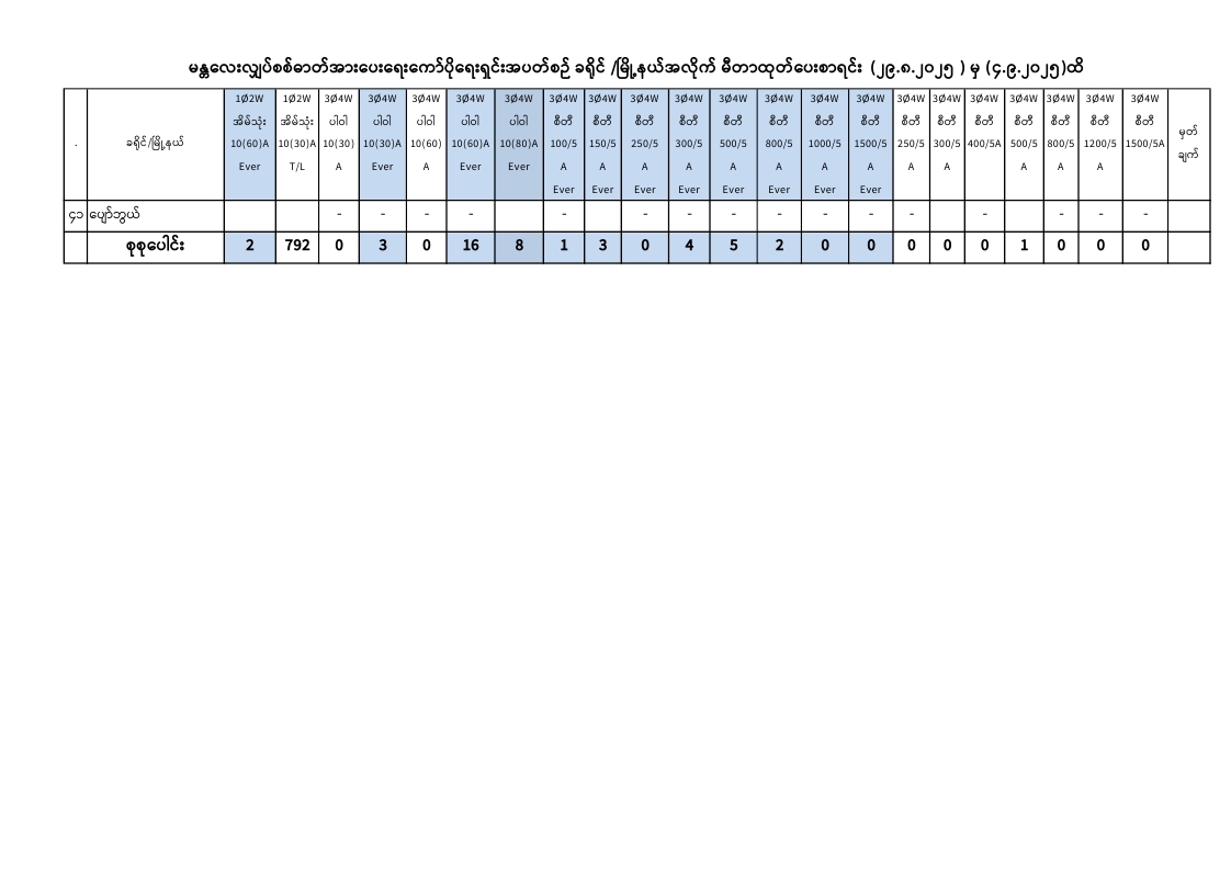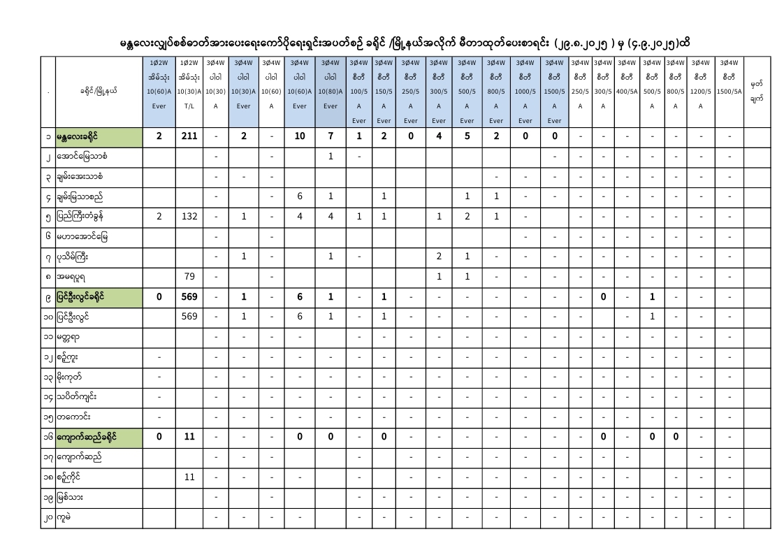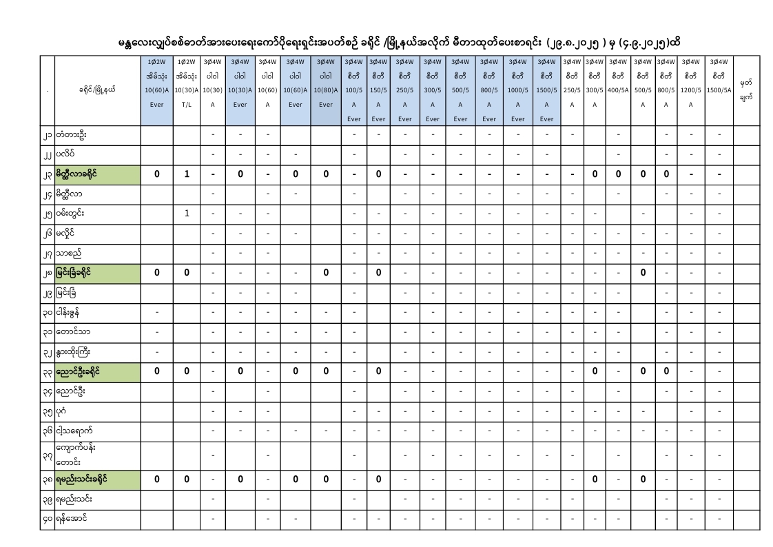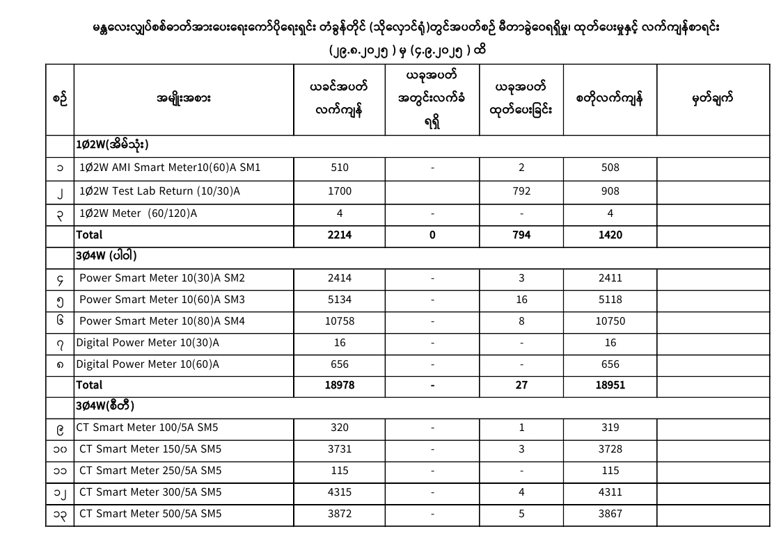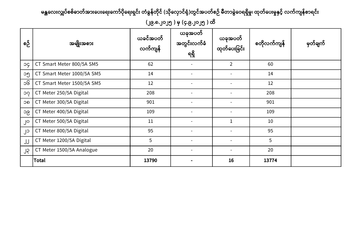 မန္တလေးလျှပ်စစ်ဓာတ်အားပေးရေးကော်ပိုရေးရှင်းတွင် (29.8.2025) ရက်နေ့မှ (4.9.2025) ရက်နေ့အထိ ခရိုင်/မြို့နယ်အလိုက် မီတာခွဲဝေရရှိမှု၊ ထုတ်ပေးမှု၊ လက်ကျန်စာရင်းများကို အောက်ပါအတိုင်းဖော်ပြအပ်ပါသည်-