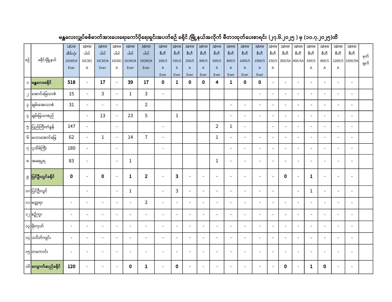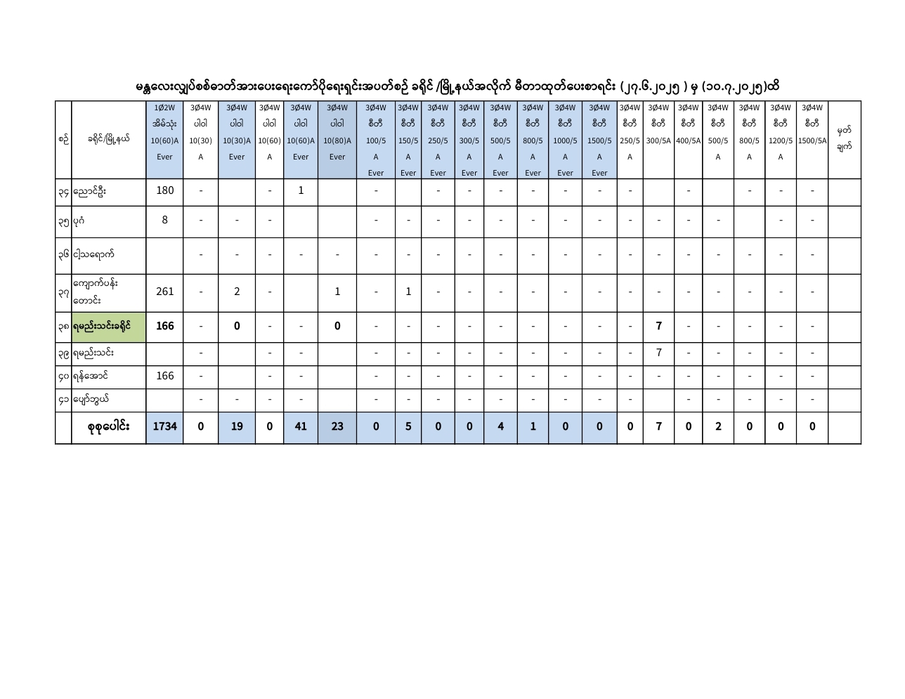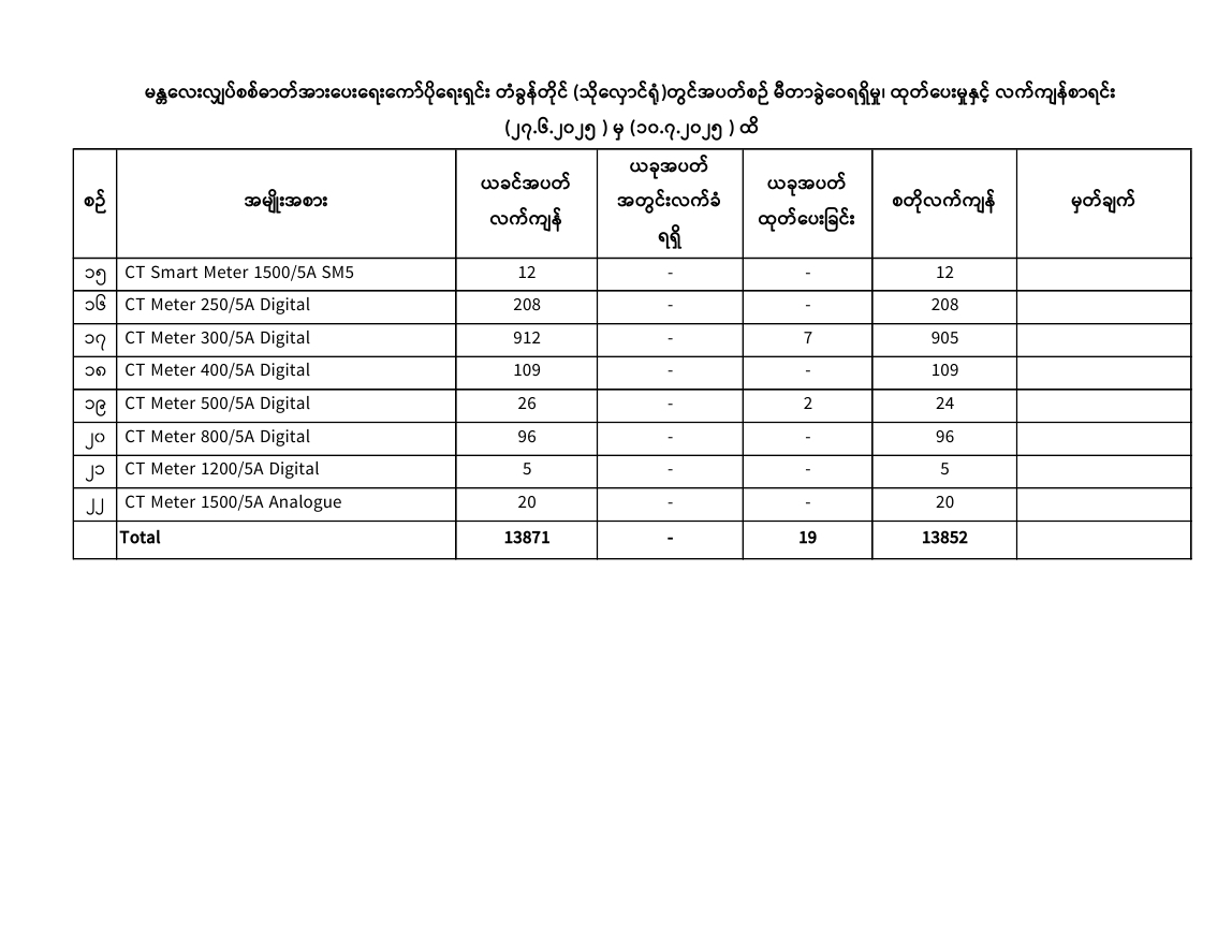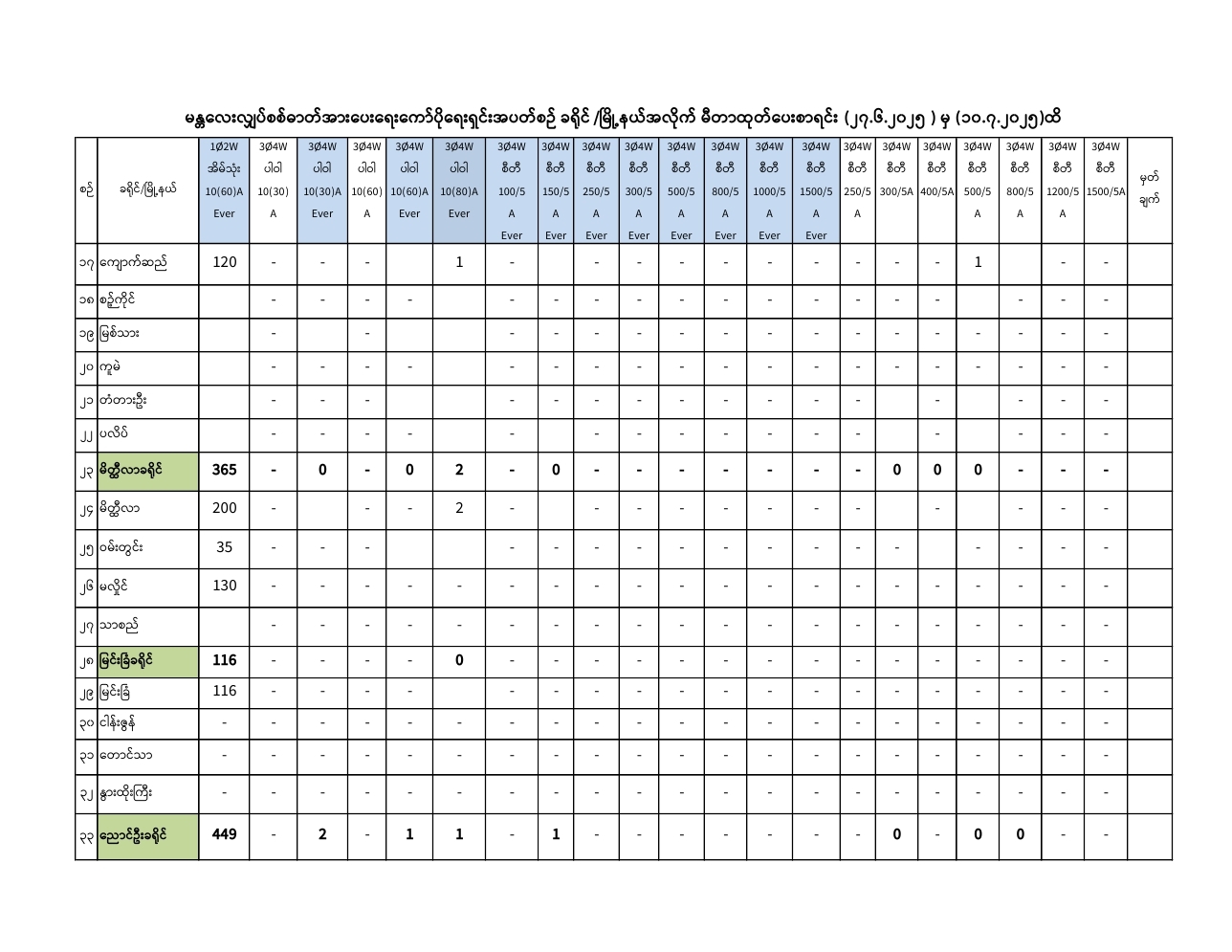 မန္တလေးလျှပ်စစ်ဓာတ်အားပေးရေးကော်ပိုရေးရှင်းတွင် ( 27.6.2025) ရက်နေ့မှ (10.7.2025) ရက်နေ့အထိ ခရိုင်/မြို့နယ်အလိုက် မီတာခွဲဝေရရှိမှု၊ ထုတ်ပေးမှု၊ လက်ကျန်စာရင်းများကို အောက်ပါအတိုင်းဖော်ပြအပ်ပါသည်-