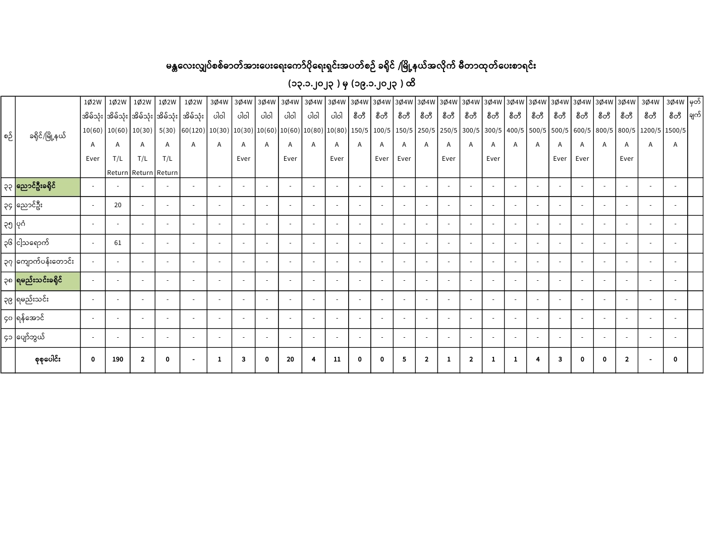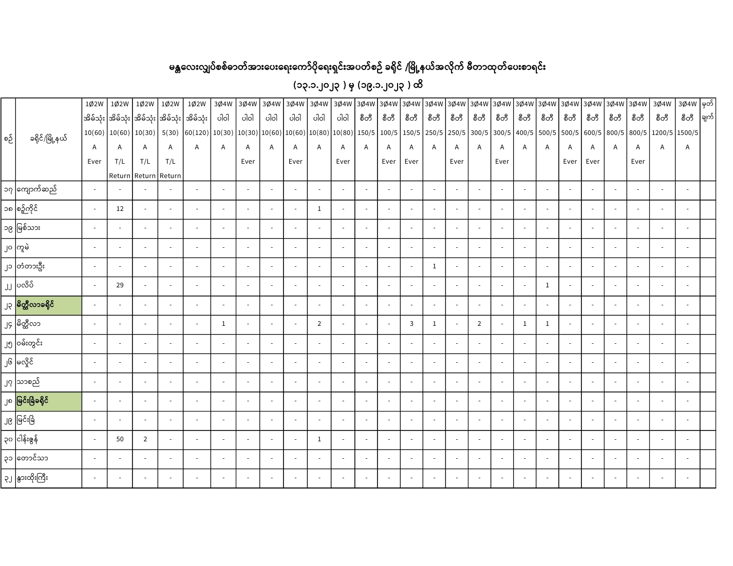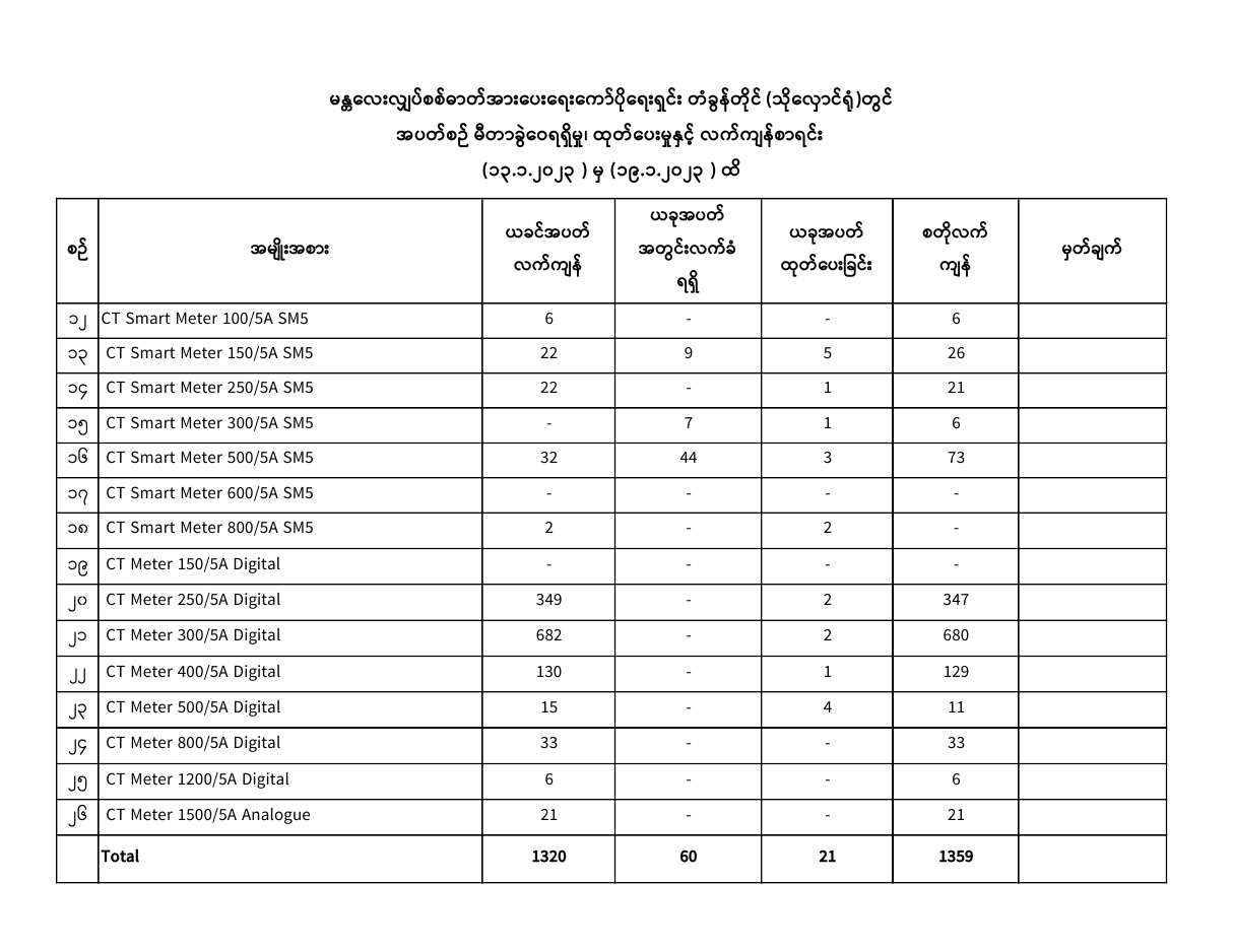 မန္တလေးလျှပ်စစ်ဓာတ်အားပေးရေးကော်ပိုရေးရှင်းတွင် (၁၃. ၁. ၂၀၂၃) ရက်နေ့မှ (၁၉. ၁. ၂၀၂၃) ရက်နေ့အထိ ခရိုင်/မြို့နယ်အလိုက် မီတာခွဲဝေရရှိမှု၊ ထုတ်ပေးမှု၊ လက်ကျန်စာရင်းများကို အောက်ပါအတိုင်း ဖော်ပြအပ်ပါသည်-