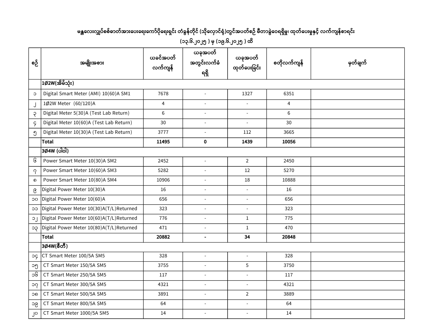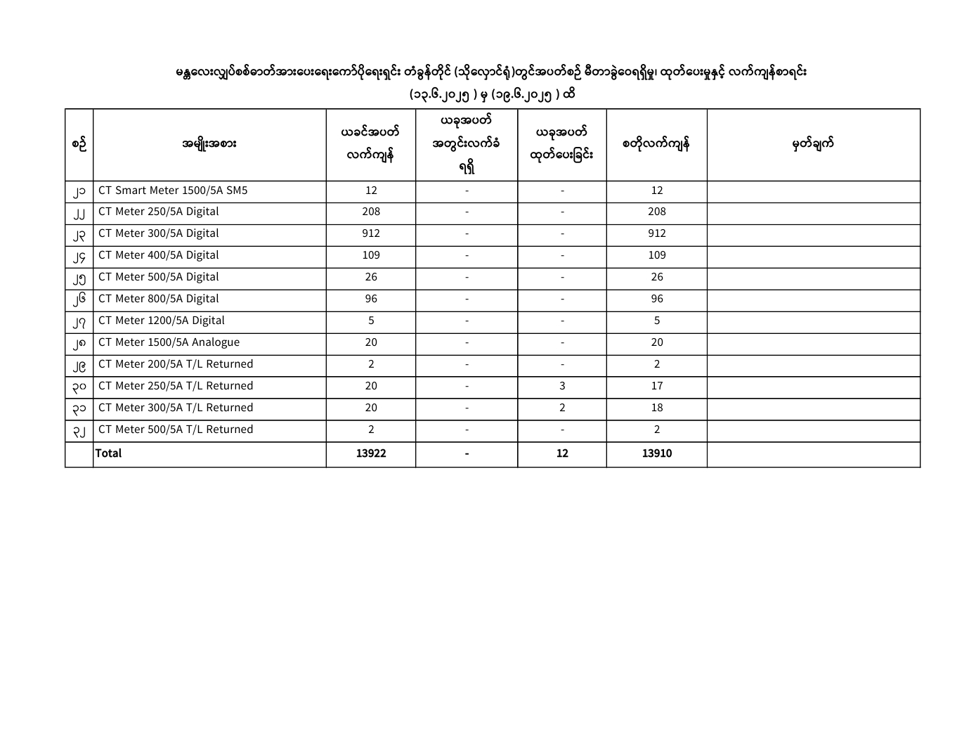 မန္တလေးလျှပ်စစ်ဓာတ်အားပေးရေးကော်ပိုရေးရှင်းတွင် ( 13.6.2025) ရက်နေ့မှ (19.6.2025) ရက်နေ့အထိ ခရိုင်/မြို့နယ်အလိုက် မီတာခွဲဝေရရှိမှု၊ ထုတ်ပေးမှု၊ လက်ကျန်စာရင်းများကို အောက်ပါအတိုင်းဖော်ပြအပ်ပါသည်-