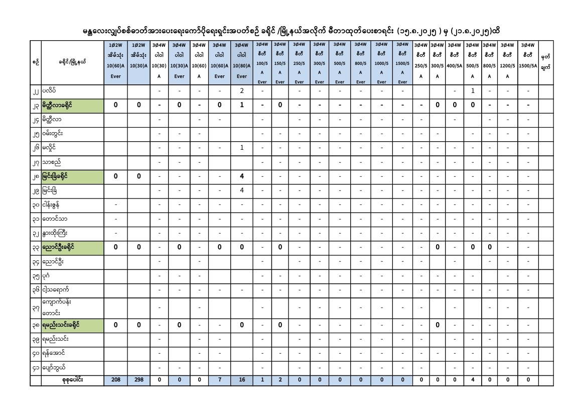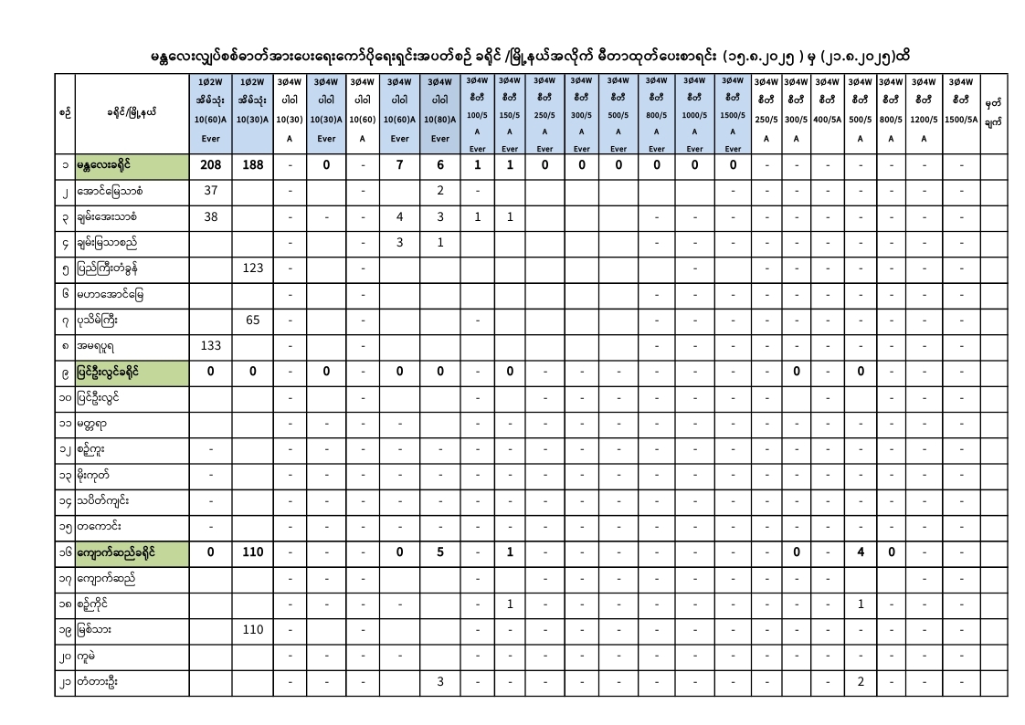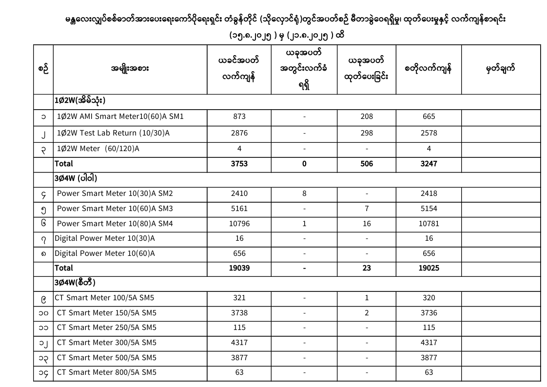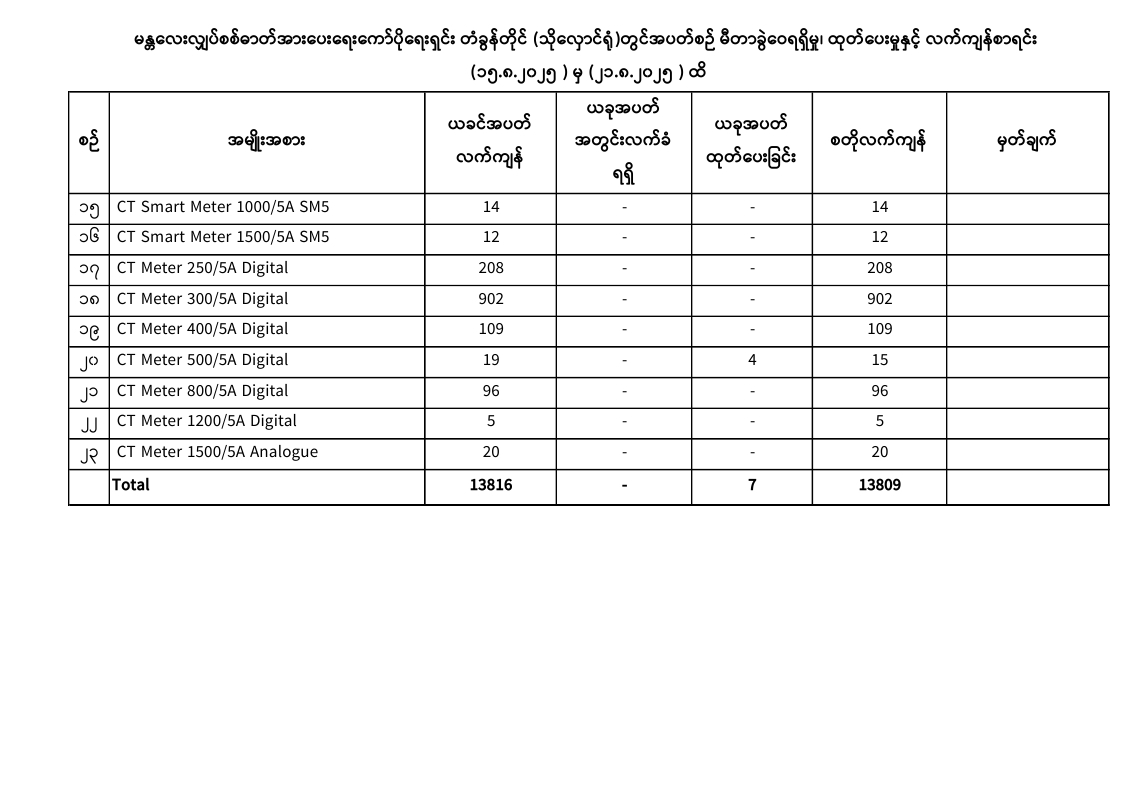 မန္တလေးလျှပ်စစ်ဓာတ်အားပေးရေးကော်ပိုရေးရှင်းတွင် (15.8.2025) ရက်နေ့မှ (21.8.2025) ရက်နေ့အထိ ခရိုင်/မြို့နယ်အလိုက် မီတာခွဲဝေရရှိမှု၊ ထုတ်ပေးမှု၊ လက်ကျန်စာရင်းများကို အောက်ပါအတိုင်းဖော်ပြအပ်ပါသည်-