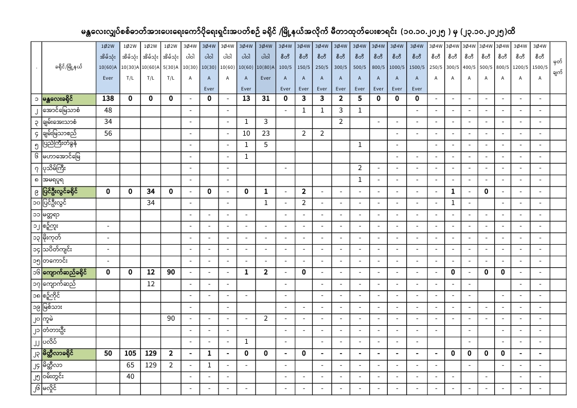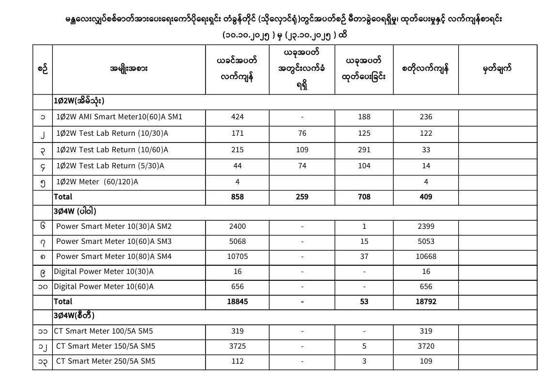 မန္တလေးလျှပ်စစ်ဓာတ်အားပေးရေးကော်ပိုရေးရှင်းတွင် (10.10.2025) ရက်နေ့မှ (23.10.2025) ရက်နေ့အထိ ခရိုင်/မြို့နယ်အလိုက် မီတာခွဲဝေရရှိမှု၊ ထုတ်ပေးမှု၊ လက်ကျန်စာရင်းများကို အောက်ပါအတိုင်းဖော်ပြအပ်ပါသည်-