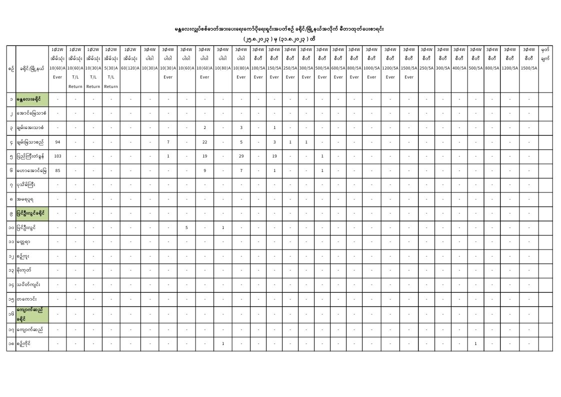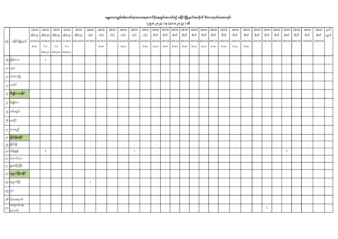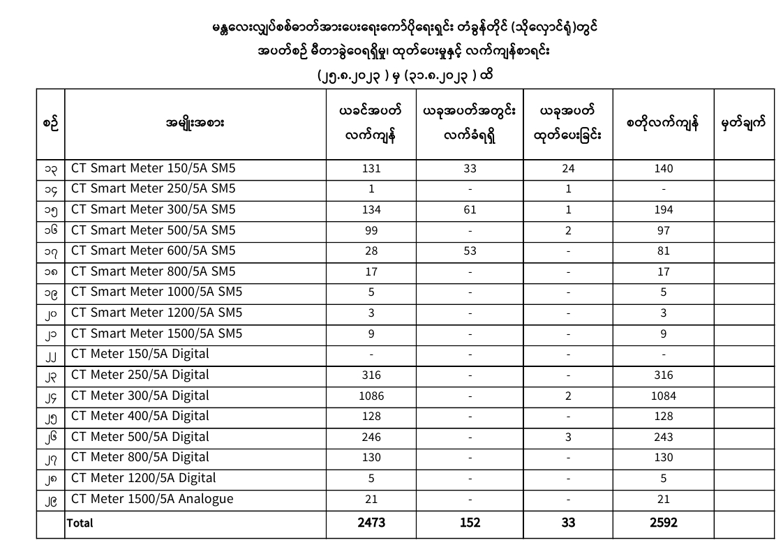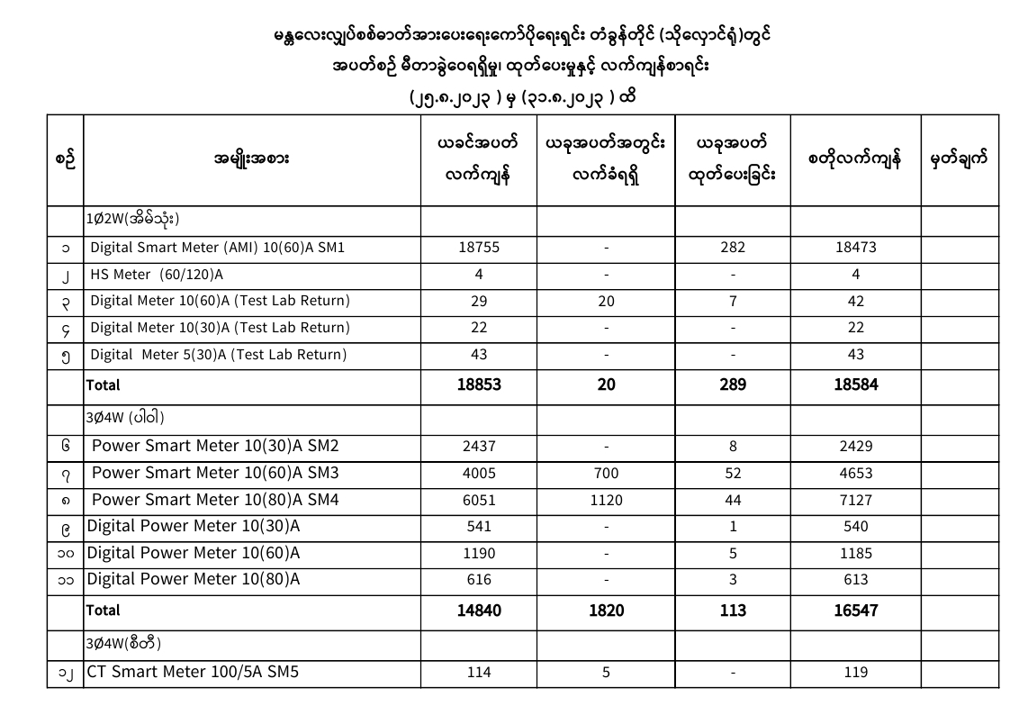 မန္တလေးလျှပ်စစ်ဓာတ်အားပေးရေးကော်ပိုရေးရှင်းတွင် (၂၅. ၈.၂၀၂၃) ရက်နေ့မှ (၃၁. ၈. ၂၀၂၃) ရက်နေ့အထိ ခရိုင်/မြို့နယ်အလိုက် မီတာခွဲဝေရရှိမှု၊ ထုတ်ပေးမှု၊ လက်ကျန်စာရင်းများကို အောက်ပါအတိုင်း ဖော်ပြအပ်ပါသည်-