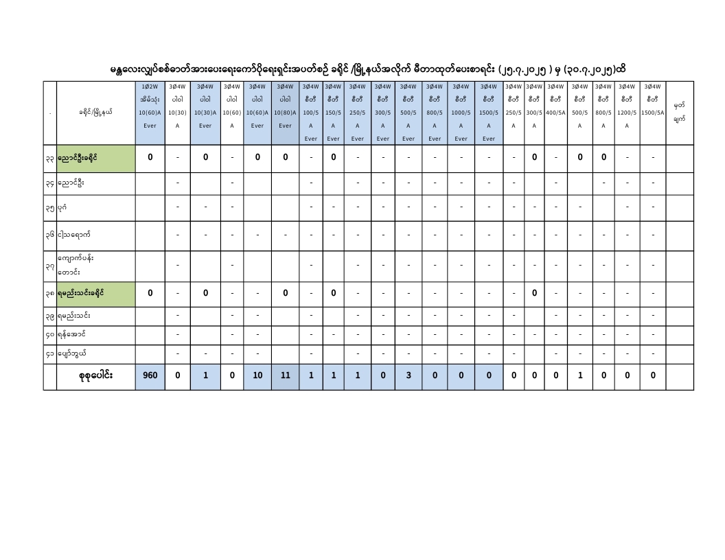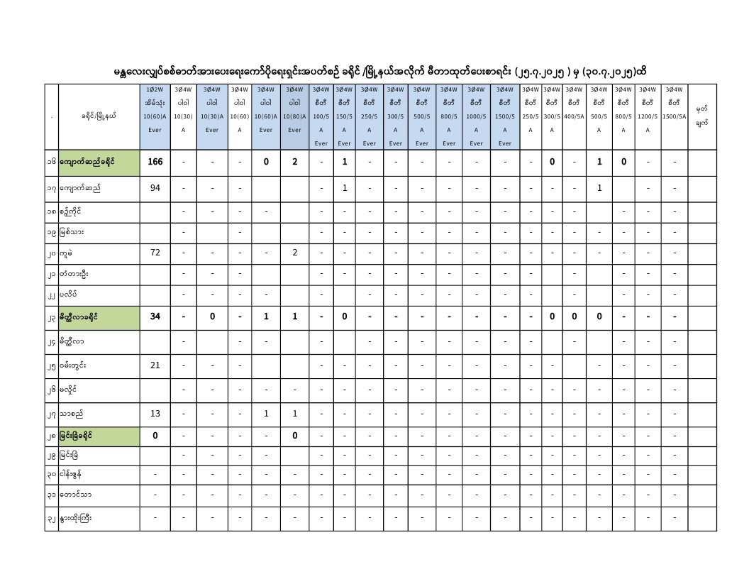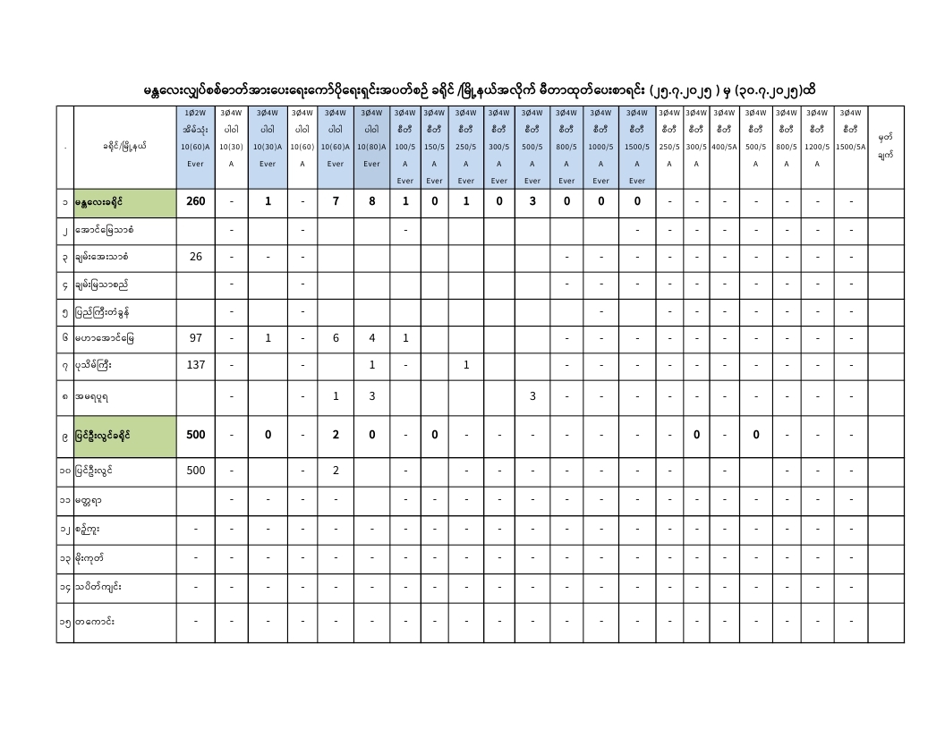 မန္တလေးလျှပ်စစ်ဓာတ်အားပေးရေးကော်ပိုရေးရှင်းတွင် ( 25.7.2025) ရက်နေ့မှ (30.7.2025) ရက်နေ့အထိ ခရိုင်/မြို့နယ်အလိုက် မီတာခွဲဝေရရှိမှု၊ ထုတ်ပေးမှု၊ လက်ကျန်စာရင်းများကို အောက်ပါအတိုင်းဖော်ပြအပ်ပါသည်-