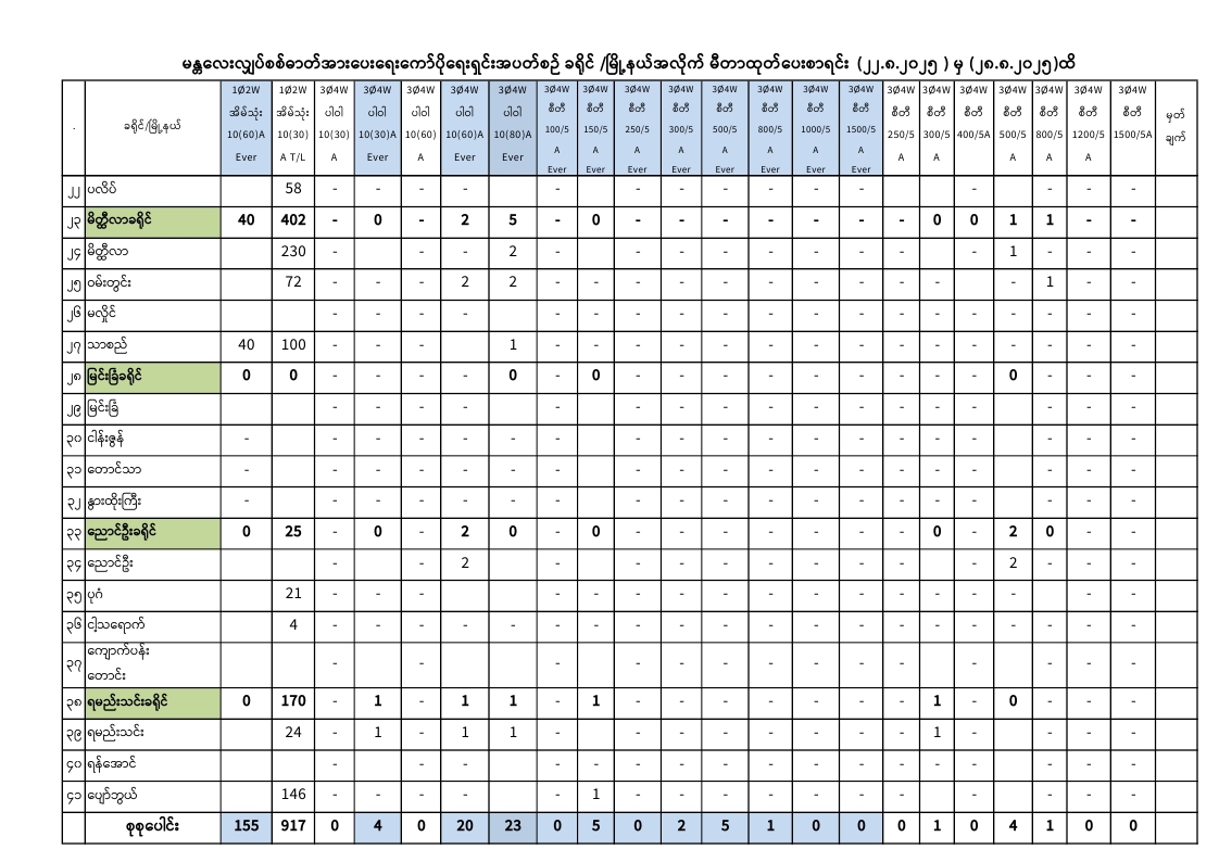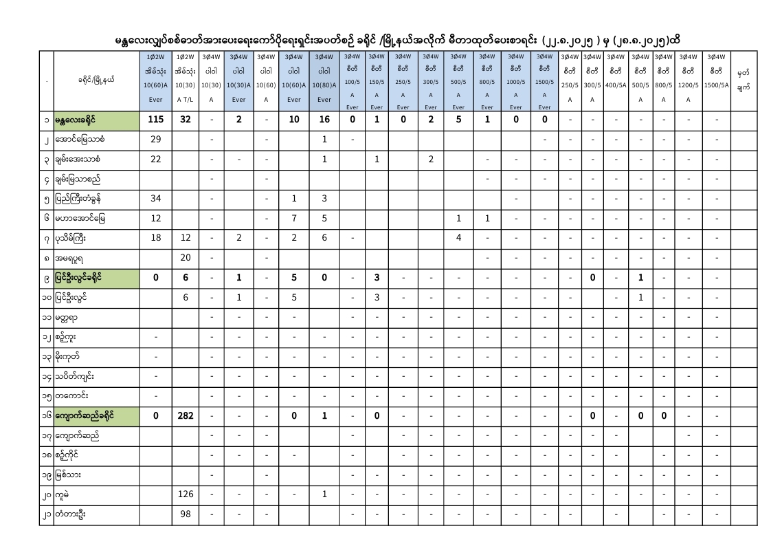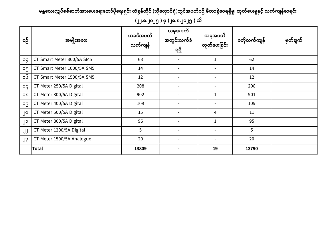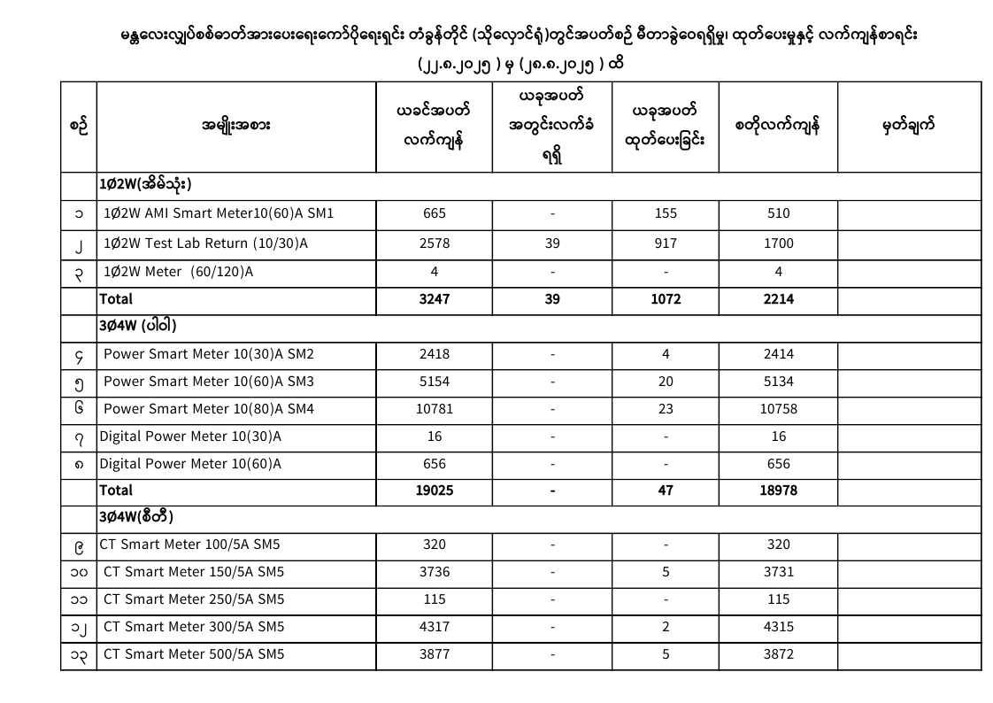 မန္တလေးလျှပ်စစ်ဓာတ်အားပေးရေးကော်ပိုရေးရှင်းတွင် (22.8.2025) ရက်နေ့မှ (28.8.2025) ရက်နေ့အထိ ခရိုင်/မြို့နယ်အလိုက် မီတာခွဲဝေရရှိမှု၊ ထုတ်ပေးမှု၊ လက်ကျန်စာရင်းများကို အောက်ပါအတိုင်းဖော်ပြအပ်ပါသည်-