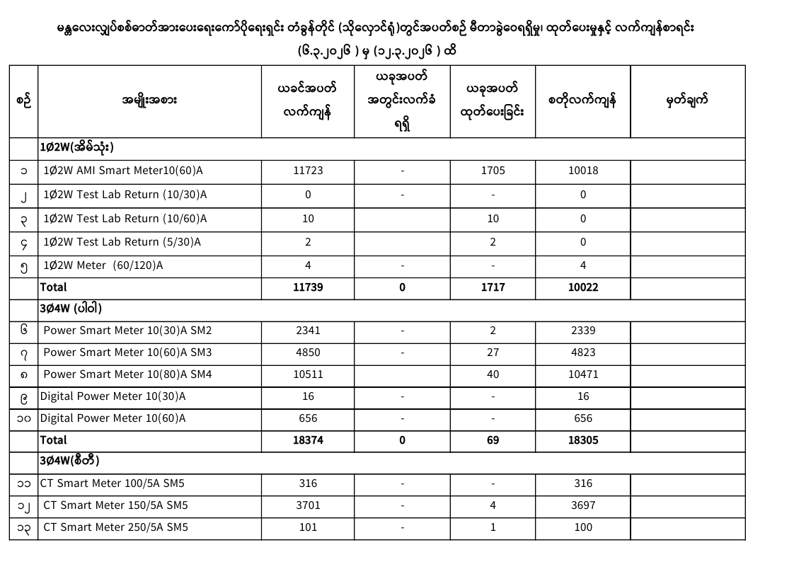 မန္တလေးလျှပ်စစ်ဓာတ်အားပေးရေးကော်ပိုရေးရှင်းတွင် ခရိုင်/မြို့နယ်အလိုက် အပါတ်စဉ် မီတာခွဲဝေရရှိမှု၊ ထုတ်ပေးမှု၊ လက်ကျန်စာရင်းများကိုဖော်ပြခြင်း။