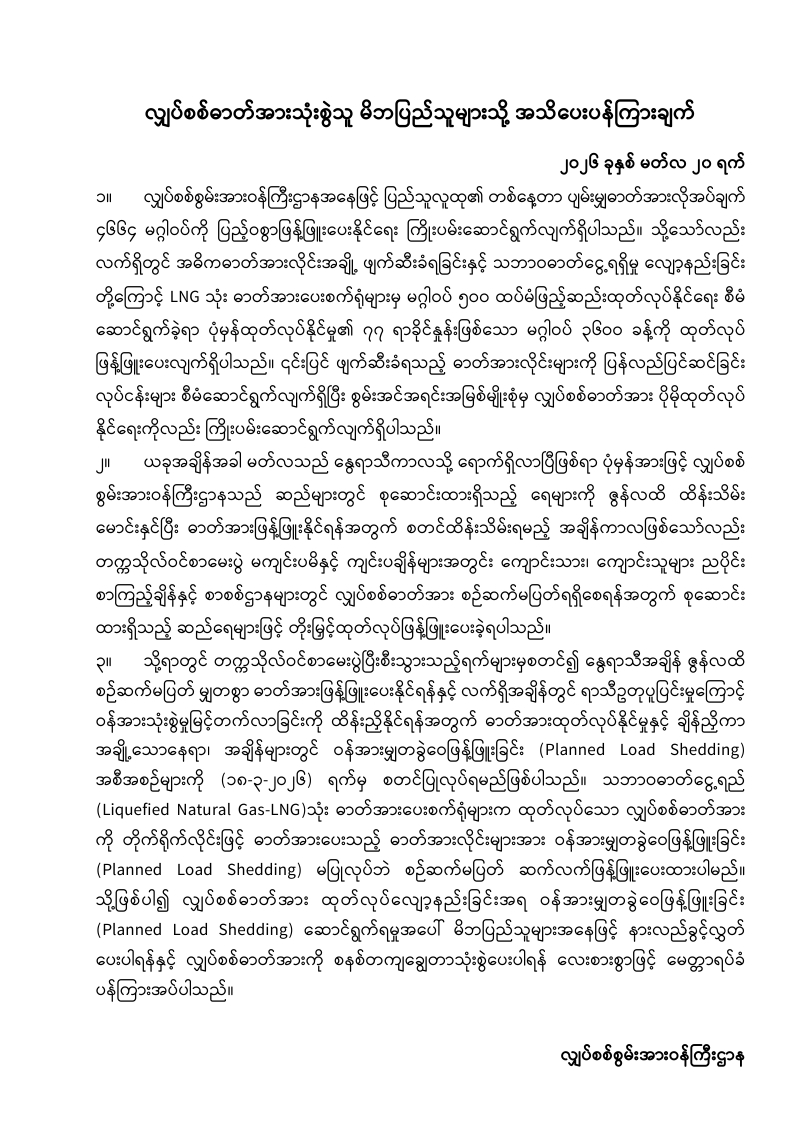 ဓာတ်အားသုံးစွဲသူများသို့ အသိပေးပန်ကြားချက်