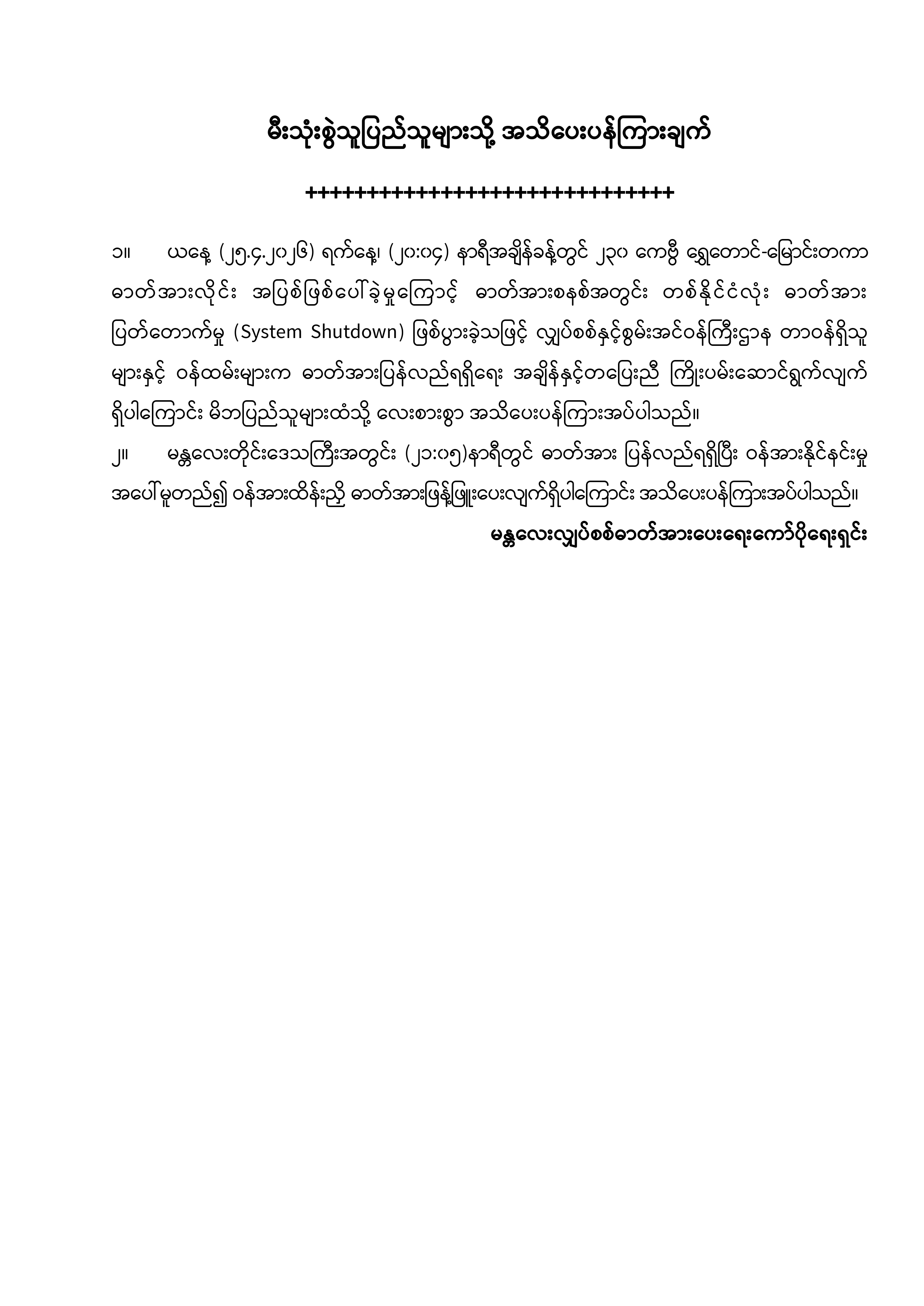 မီးသုံးစွဲသူပြည်သူများသို့ အသိပေးပန်ကြားချက်