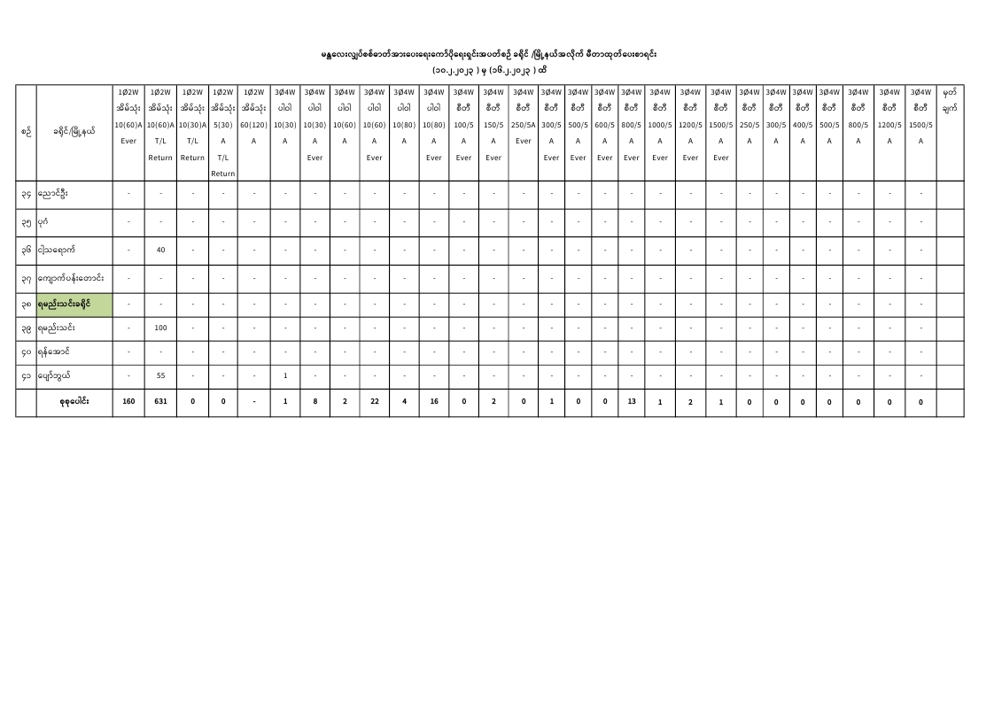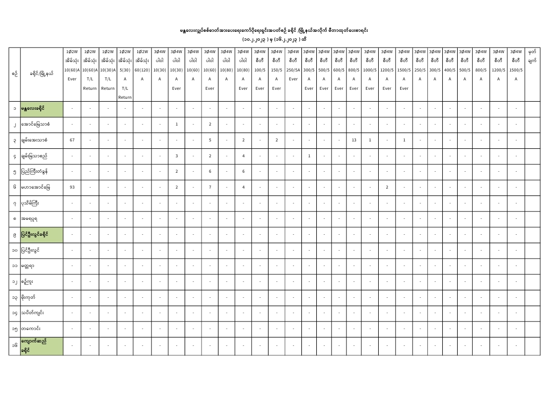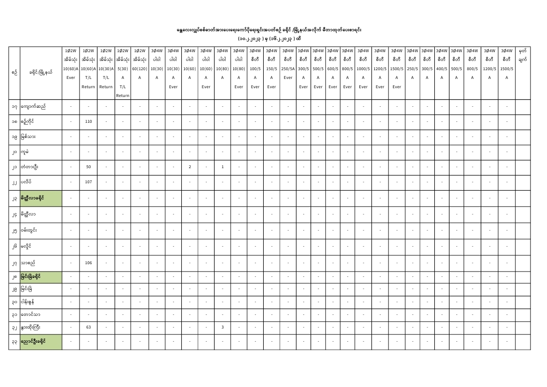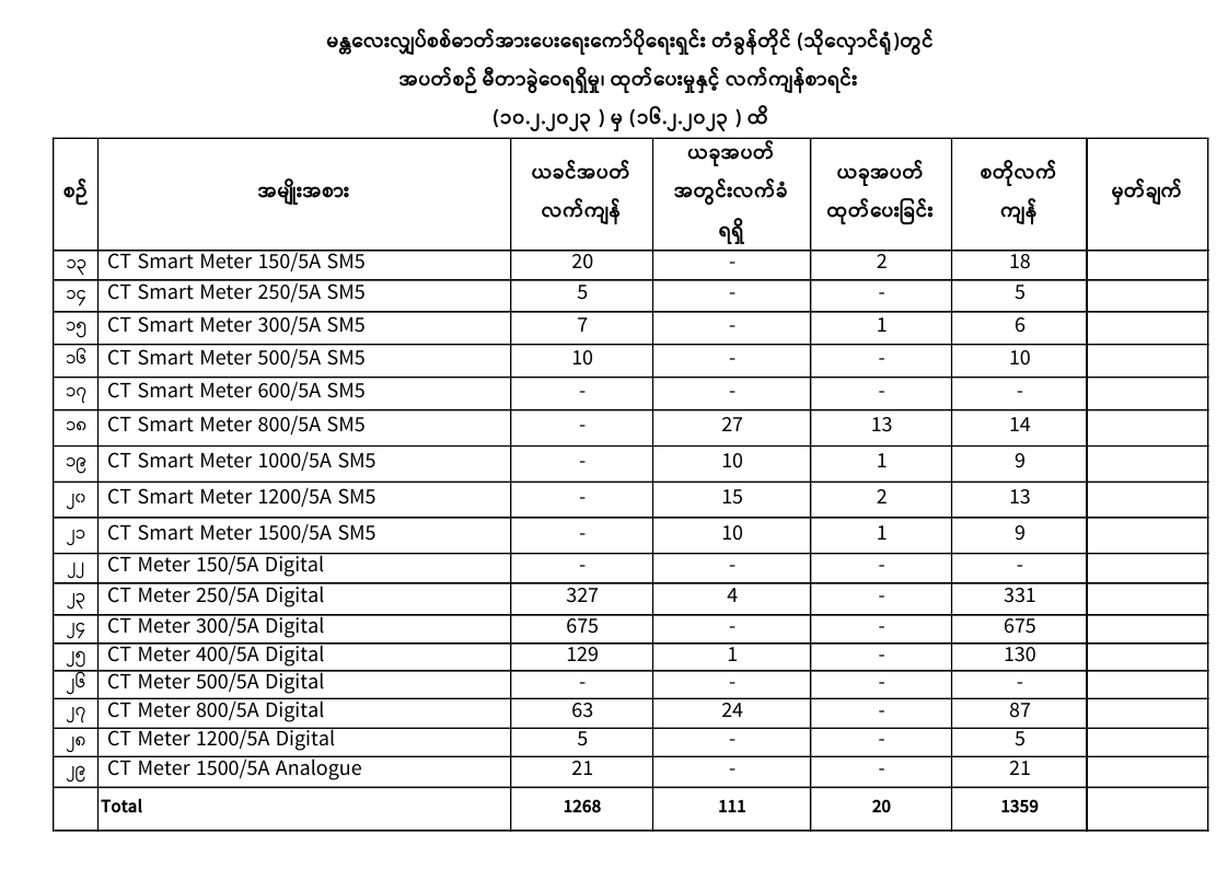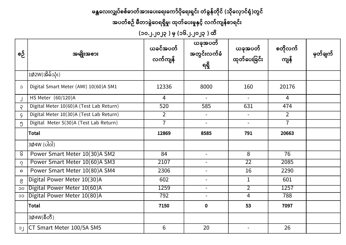 မန္တလေးလျှပ်စစ်ဓာတ်အားပေးရေးကော်ပိုရေးရှင်းတွင် (၁၀. ၂.၂၀၂၃) ရက်နေ့မှ (၁၆. ၂. ၂၀၂၃) ရက်နေ့အထိ ခရိုင်/မြို့နယ်အလိုက် မီတာခွဲဝေရရှိမှု၊ ထုတ်ပေးမှု၊ လက်ကျန်စာရင်းများကို အောက်ပါအတိုင်း ဖော်ပြအပ်ပါသည်