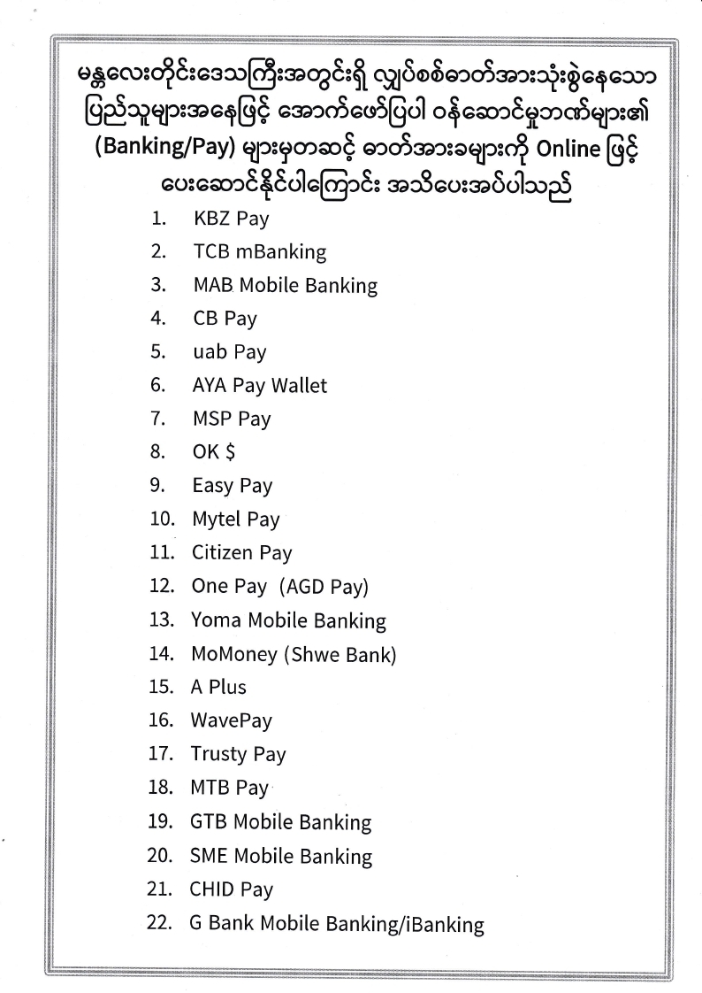 Online မှတစ်ဆင့် လျှပ်စစ်ဓာတ်အားခ ပေးဆောင်ခြင်း